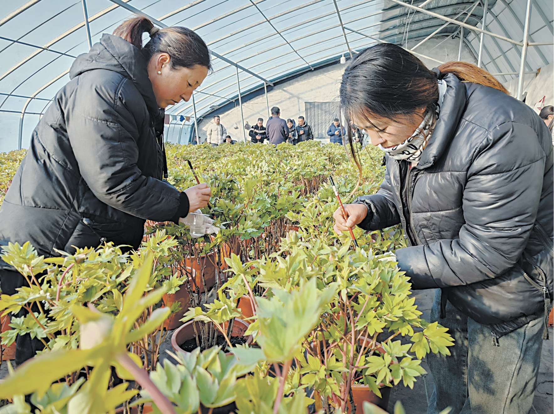 牡丹傲霜雪,春色犯寒来。1月5日是农历二十四节气中的“小寒”,菏泽一座座催花大棚内却春光融融,早期牡丹次第上市销售,晚期牡丹正在拔节生长。“目前是大棚催花牡丹生长最快的时候,花蕾直径每天长2毫米左右,枝条每天长1厘米左右。”菏泽花王牡丹产业园总经理赵文双说,目前催花大棚内的温度晚上一般在10℃左右,白天一般不超过25℃。在他的身后,几名女工在进行田间管理。只见她们用毛笔蘸着一种淡黄色的药水,涂抹到牡丹花蕾上——这是促进花蕾生长发育的,使牡丹花朵更大、色彩更艳丽。“这批催花牡丹正处于大风铃期,枝条伸展、叶片流翠,待后期出棚上市时叶片要比现在扩大4倍左右,真正做到枝繁叶茂、美丽‘出阁’。”赵文双介绍。