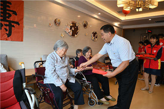 9月27日,菏泽市福利彩票销售和管理中心主任冯相珍带领部分党员和志愿者,到菏泽市居家和社区养老服务示范中心开展志愿服务和慰问活动,为生活在这里的60位老人送去了月饼、牛奶等慰问品,并希望社会上更多的爱心人士关注老年人生活。 记者 马 琳 摄