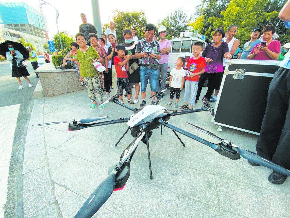 在城区八一天香路口,青航队出动了2台警用无人机对周边路段开展空中巡查,利用喊话设备对路面电动车及行人不文明行为进行了喊话劝导。