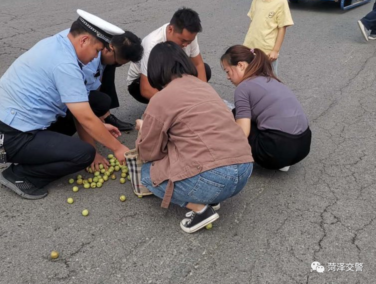 菏泽交警鄄城大队民警恰巧巡查路过,见此情景立即下车适当干预交通,另有2名民警上前帮忙捡拾水果,交警的举动也引来过往的其他路人参与帮忙,散落的水果很快得到捡拾,交通秩序得以快速恢复,民警的举动受到过往群众纷纷点赞。