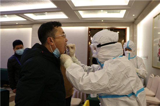 1月25日,医护人员全副武装,对市十九届人大六次会议工作人员进行核酸检测,严把安全防疫关口,为会议安全召开提供可靠保障。根据会议安排,本次会议采取严格防疫程序,与会人员全员接受核酸检测,实行“进场即封闭”,酒店全面做好环境清洁消毒,通过“点对点”交通方式(统一乘坐车辆)抵达会议地点,乘坐前后对交通工具进行清洁消毒。