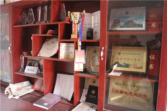回忆起自己的习武经历,陈洪元将目光投向满屋子的奖杯和证书,向牡丹晚报全媒体记者娓娓道来,“小时候我的体格长得比一般孩子要大些,受父亲陈书德及伯父陈书贵习武熏陶,自小羡慕不及,便偷偷跟着大人练习武术架势,并立志习武健身。”陈洪元说,“起先父母是不让我练武的,主要是太辛苦,于是我就一边帮助父母劳作,一边寻找一切机会练习。不管是放羊还是干农活,只要有时间有条件,我就去耍两遍。可能是我稍有习武天分,不到两年时间,佛汉拳套路及功法已熟练掌握。”