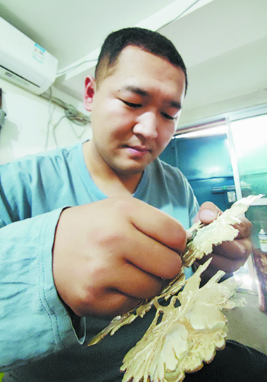 这是一件牡丹錾刻的半成品,花瓣的形状、叶片的脉络都清晰可见……