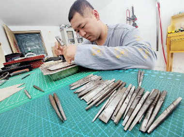 偶然间听父辈提起祖辈曾做过乡间银匠的故事,王新博决定寻找银器錾刻工艺这门手艺,便去往有着“小炉匠村”之称的云南鹤庆新华村学习錾刻技艺。2016年,央视文物修复类纪录片《我在故宫修文物》让他坚定了“这些老手艺必须传下去……”的信念。学成回到菏泽,他将车库改装成工作室。