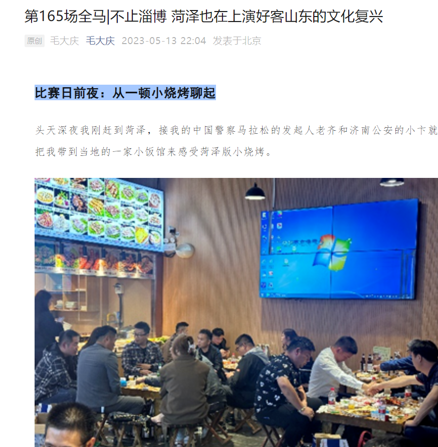 5月13日,著名企业家毛大庆,网上发文点赞“花样菏泽”。原因是近日他到菏泽参加马拉松比赛,被两件事深深打动。其一是在朋友带他去体验“菏泽烧烤”时,一位热情的小伙子得知他是特意从北京赶来参加马拉松的,就给他热情介绍菏泽,“俨然是个导游”,还帮他们买了单。不禁让毛大庆感叹山东大汉的豪爽与好客。其二是因为要参加马拉松比赛,他们出门的时间太早,酒店的早餐还没开。结果,比赛日凌晨,他刚起床,就有人敲门,山东的朋友已经把早餐送到门口。“让我心里暖暖的”。他说,在菏泽感受的是淳朴热情的城市文化状态。一座城市的发展,如果能让良好的营商环境和淳朴的民风相融合,肯定能带来更多的招商引资人才吸附效应。