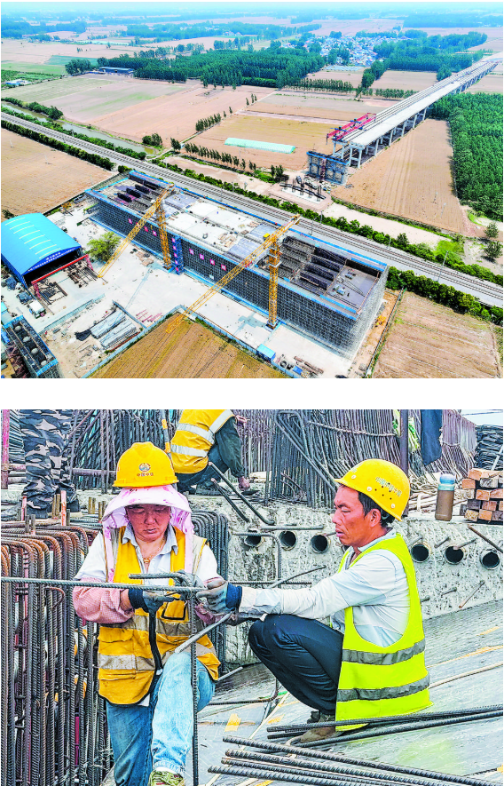 6月18日,徐民高速单曹段上跨京九铁路立交桥工程建设现场,工人们正在进行转体梁4号块钢筋绑扎作业。据了解,该工程全长1217.5米(包含涉铁部分、引桥部分),正在建设的转体梁总长190米,采用先支架现浇后转体法施工,逆时针转体85.3°。目前,跨京九铁路转体桥下部结构完成100%,转体梁0号和1号块已施工完成,3号块底板、腹板钢筋绑扎完成80%,正在安装内模作业,4号和5号块施工正有序地进行中。