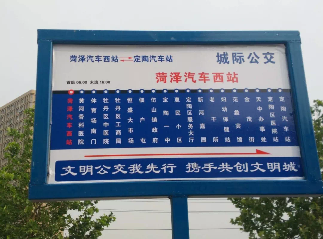 菏泽汽车西站-黄河骨科医院-体育场南门-牡丹区中医院-牡丹区工商局-恒盛大市场-佃户屯-仿山镇政府-定陶一中-惠民小区-定陶区服务大厅-新河嘉园-老干所-妇幼保健站-范蠡宾馆-金茂街-天中办事处-定陶区医院站-定陶汽车站