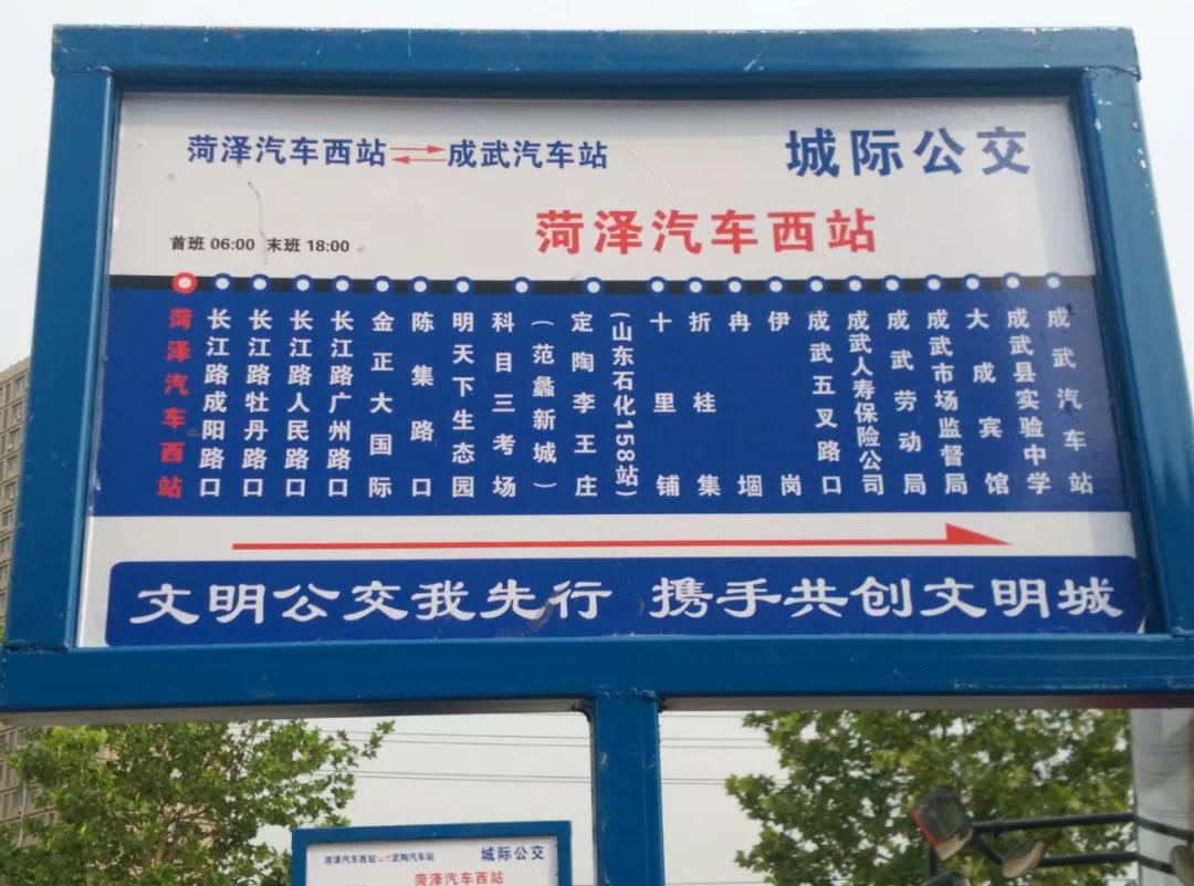 菏泽汽车西站-长江路成阳路口-长江路牡丹路口-长江路人民路口-长江路广州路口-金正大国际-陈集路口-明天下生态园-科目三考场(范蠡新城)-定陶李王庄(山东石化158站)-十里铺-折桂集-冉堌-伊岗-成武五叉路口-成武人寿保险公司-成武劳动局-成武市场监督局-大成宾馆-成武县实验中学-成武汽车站
