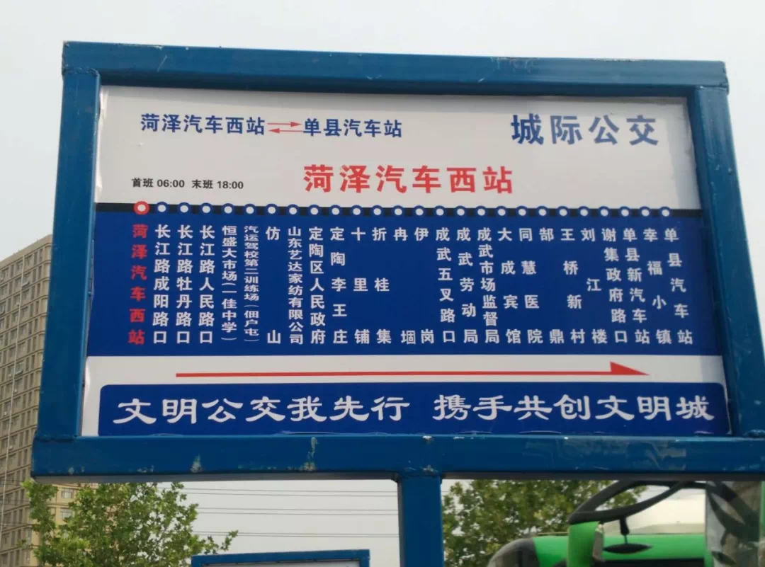 菏泽汽车西站-长江路成阳路口-长江路牡丹路口-长江路人民路口-恒盛大市场(一佳中学)-汽运驾校第二训练场(佃户屯)-仿山-山东艺达家纺有限公司-定陶区人民政府-定陶李王庄-十里铺-折桂集-冉堌-伊岗-成武五叉路口-成武劳动局-成武市场监督局-大成宾馆-同慧医院-郜鼎-王桥新村-刘江楼-谢集政府路口-单县新汽车站-幸福小镇-单县汽车站