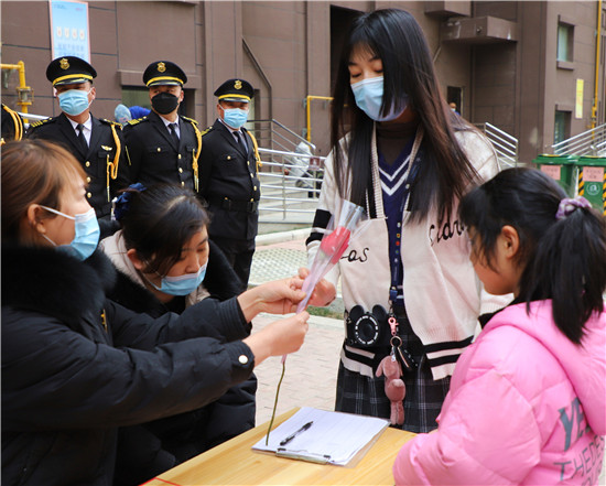 3月6日,在一年一度的“三八”国际劳动妇女节到来之际,为了让女同胞们感受到节日的幸福和快乐,绿地花都国际——菏泽美好嘉物业精心准备了一支支娇艳欲滴的玫瑰花,向绿地花都国际的女业主们送上诚挚的祝福。收到祝福和鲜花,大家露出了美丽的笑容,同时对物业的暖心服务表示由衷感谢。图为物业工作人员向一位女业主送上玫瑰花。记者 李亚楠 摄