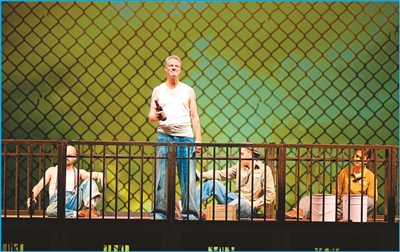 演出开场,铁丝网幕在昏暗的冷光里升起,囚犯们在铁笼里形如困兽。这一场景勾勒出肖申克监狱的阴森可怖,压迫感令人屏息。遇到暴力冲突时,血红色灯光瞬间笼罩舞台,渲染出紧张氛围。每逢监狱操场上的闲谈时刻,暖黄色灯光洒下,幕布上的高墙外飘着几行疏云,透出难得的安适。