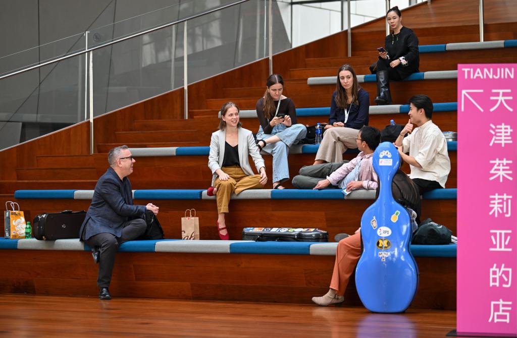 美国茱莉亚415古乐团师生在天津茱莉亚学院排练间隙交流(10月12日摄)。新华社记者 孙凡越 摄