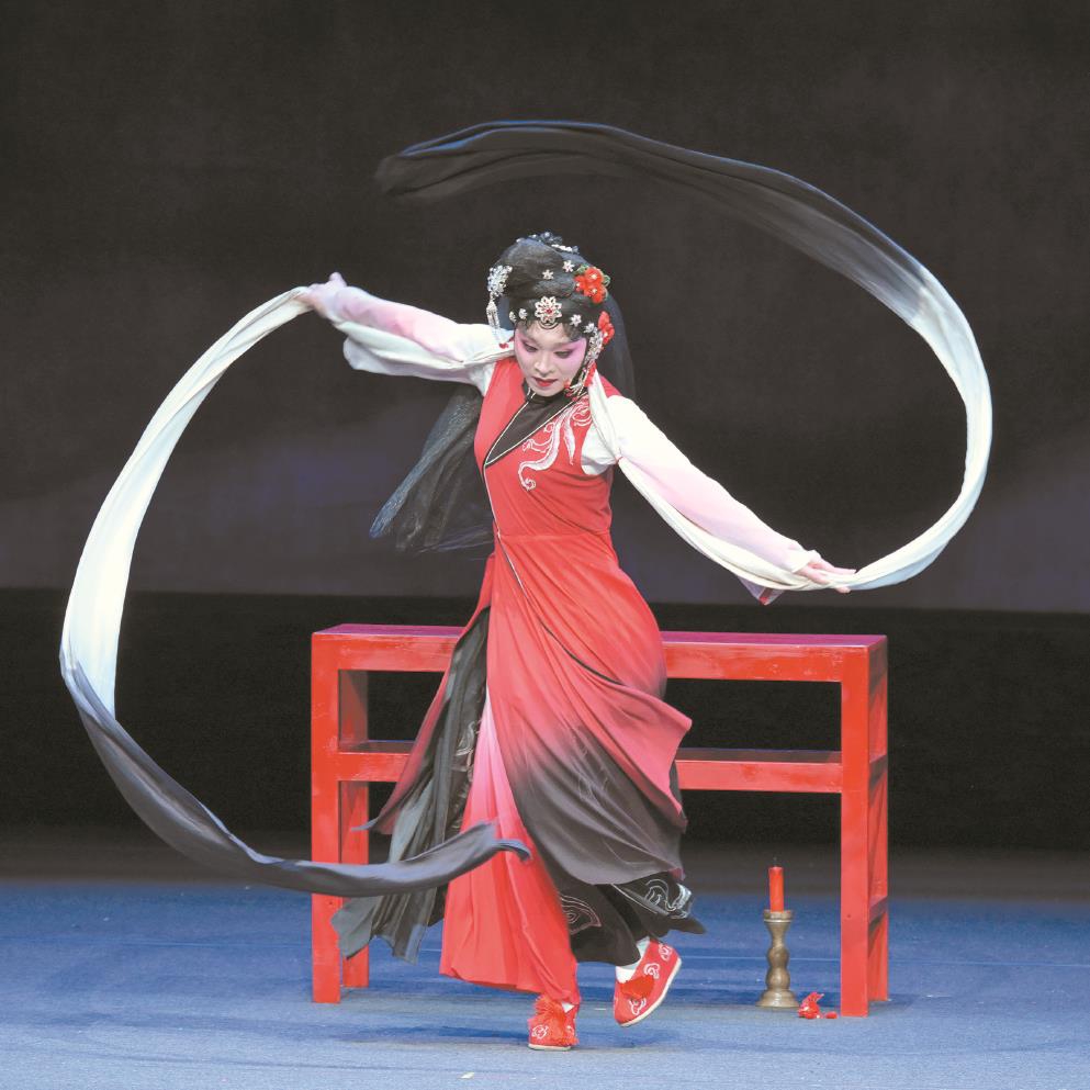 梅花奖终评预热阶段,鲍陈热在几场快闪和导赏中演示了《阎婆惜·活捉三郎》桌上踹凳的惊人一跳,事实上,《活捉三郎》这出折子戏特别生动地呈现了台州乱弹如何博采众长又独树一帜。《活捉三郎》是“水浒戏”中一折,在京昆等各大剧种里都是常演剧目。阎惜姣死于宋江刀下,变作厉鬼,索命情夫张文远,舞台上的旦角既是艳鬼又是厉鬼,女演员的鬼步和水袖动作技术难度高,可看性强,既有风情万种的艳丽,又凶狠凄厉,使人胆寒。台州乱弹的《活捉三郎》大致沿用了昆剧的框架,鲍陈热也曾向昆剧名家梁谷音学习。在昆剧程式已经相当完整的前提下,台州乱弹很明显向民间观赏趣味倾斜,充分利用一桌二椅,加入几组高难度的跳跃和造型,不仅场面火爆,也让整个折子的表演节奏感更突出了。