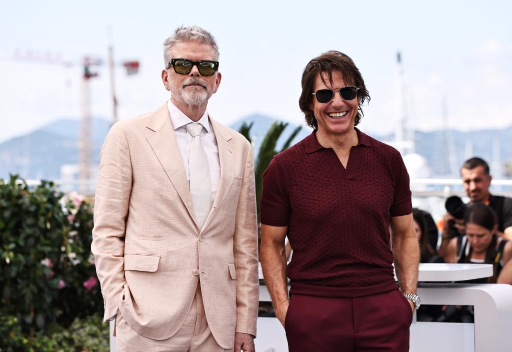 5月14日,在法国戛纳举行的第78届戛纳国际电影节上,《碟中谍8:最终清算》导演克里斯托夫·迈考利(左)和主演汤姆·克鲁斯亮相拍照式。新华社记者 高静 摄