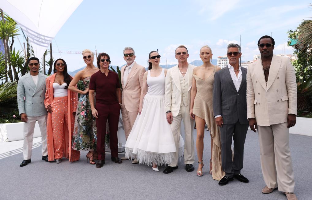 5月14日,在法国戛纳举行的第78届戛纳国际电影节上,美国导演克里斯托夫·迈考利(左五)、美国演员汤姆·克鲁斯(左四)等《碟中谍8:最终清算》主创人员亮相拍照式。新华社记者 高静 摄