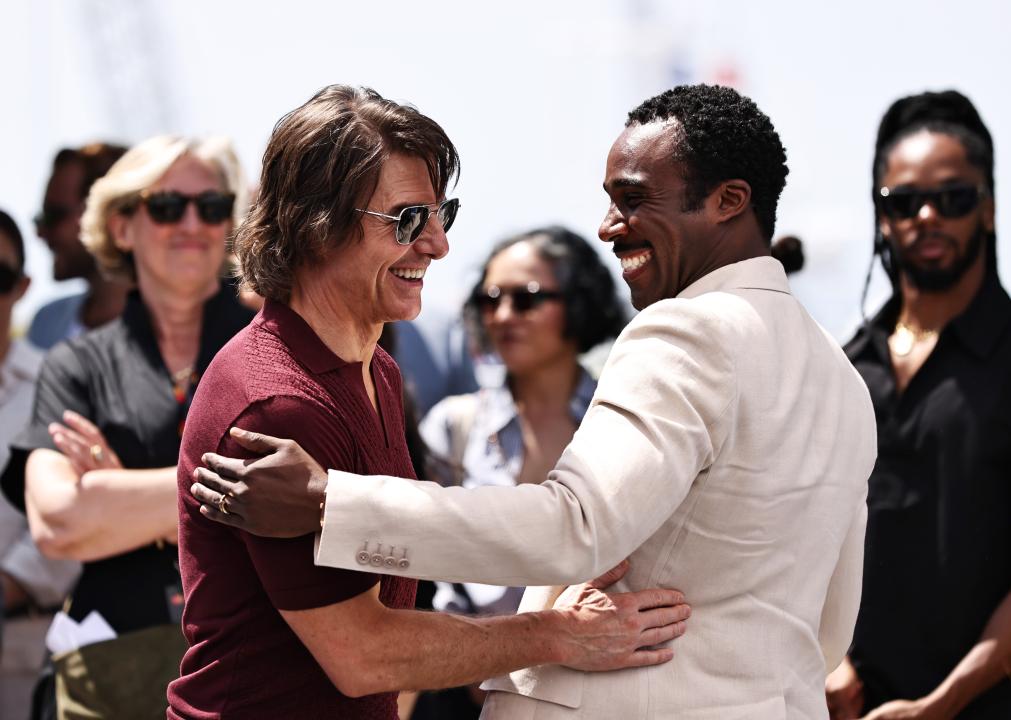 5月14日,在法国戛纳举行的第78届戛纳国际电影节上,《碟中谍8:最终清算》主演、美国演员汤姆·克鲁斯(左)和特拉梅尔·蒂尔曼亮相拍照式。新华社记者 高静 摄