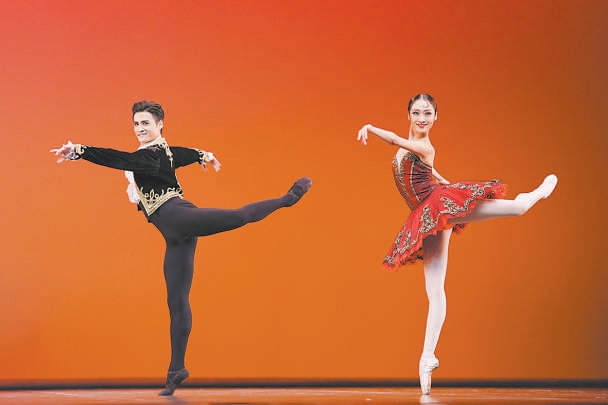 赵欣悦(右)、卢陈奇演绎芭蕾舞剧《堂·吉诃德》选段《婚礼双人舞》。