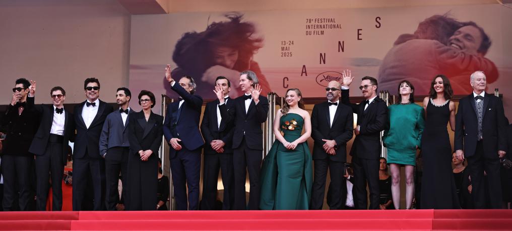 5月18日,在法国南部小城戛纳举行的第78届戛纳国际电影节上,导演韦斯·安德森携主创人员出席主竞赛单元影片《腓尼基计划》首映式。新华社记者 高静 摄