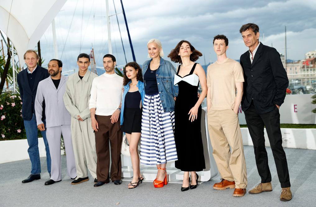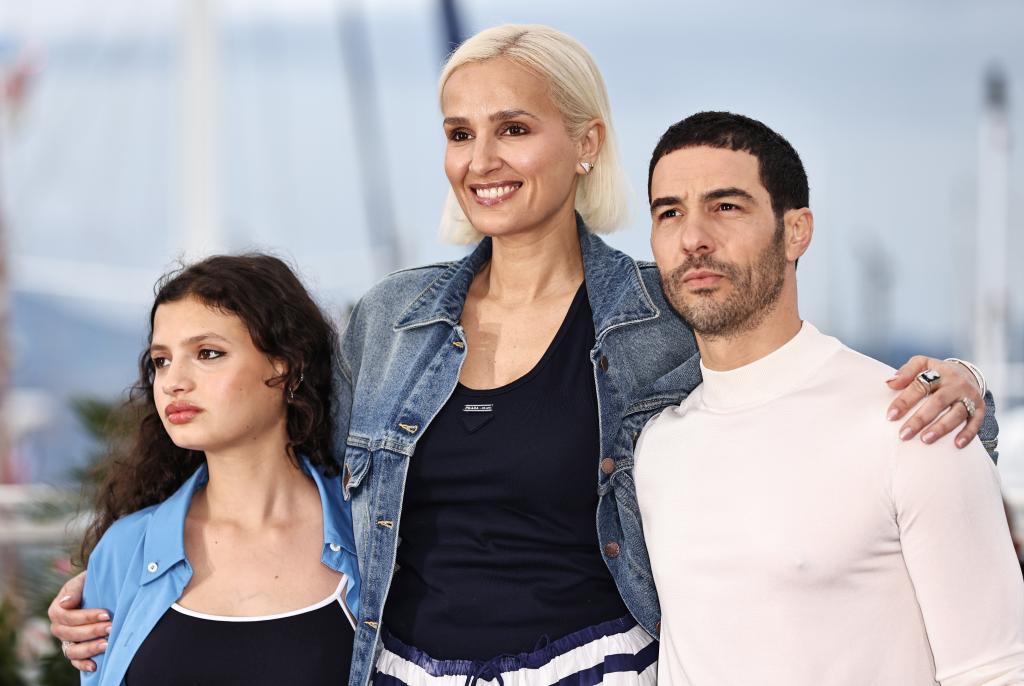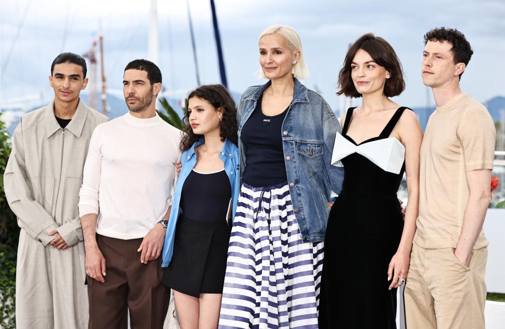 5月20日,在法国南部小城戛纳举行的第78届戛纳国际电影节上,法国导演朱利娅·迪库尔诺(中)、演员梅利莎·博罗斯(左)和塔哈·拉希姆亮相主竞赛单元影片《阿尔法》拍照式。新华社记者 高静 摄