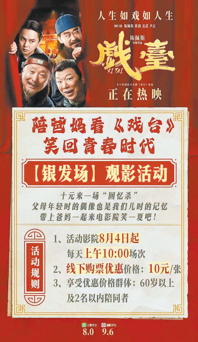 《戏台》则推出“银发场”特惠活动。“效果特别好,线上线下都传开了,很多观众打电话来咨询。”冯贺楠说,北京大约四分之一的影院都有“银发场”,他所在影院的“银发场”上座率在《戏台》所有场次中是最高的。 (北京晚报记者 袁云儿)