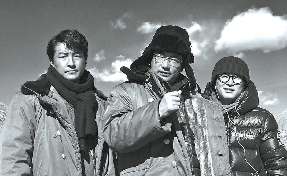 《撞死了一只羊》杀青照,左起达杰丁增、万玛才旦、吕松野(摄影师)