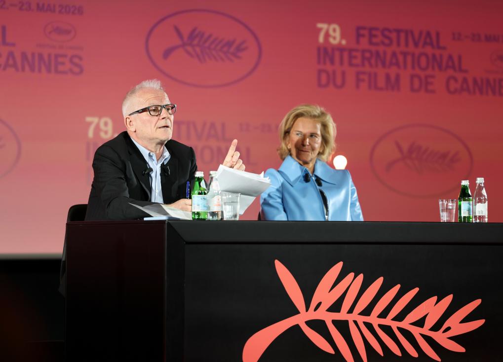4月9日,戛纳电影节主席伊丽丝·克诺布洛赫(右)与戛纳电影节艺术总监蒂埃里·弗雷莫出席在法国巴黎举行的新闻发布会。新华社记者 邬惠我 摄