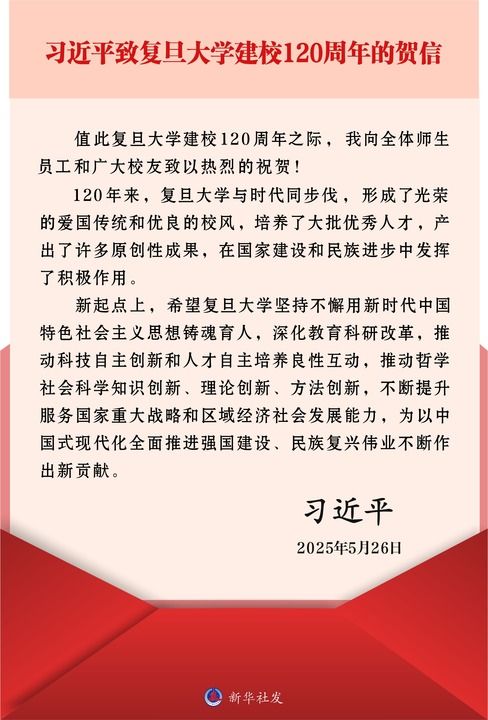 新华社北京5月26日电 中共中央总书记、国家主席、中央军委主席习近平26日致信祝贺复旦大学建校120周年,向全体师生员工和广大校友致以热烈的祝贺。