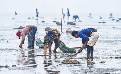 图为渔民在东港滩涂采收贝类。 刘海东摄(人民视觉)