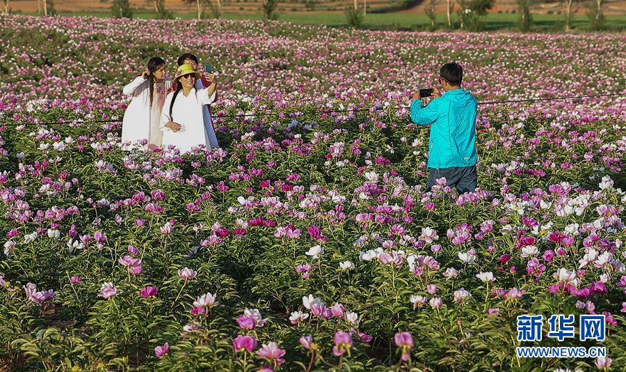 6月1日,游客在大板镇三家子村中草药种植基地的芍药花海中拍照。 近日,辽宁阜新蒙古族自治县大板镇三家子村中草药种植基地的600余亩芍药进入盛花期,吸引游客前来观赏游玩。 新华社记者龙雷摄