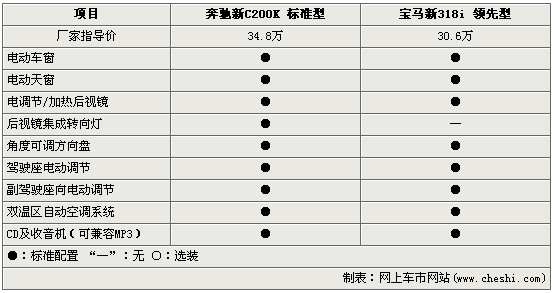 在豪华配置方面,两款豪华中级车更是不遗余力的配备各自高端配置。电动天窗、电动座椅、以及分区自动空调均成为两款车的标准配置。通过以上的详实解析,相信您对奔驰新C200K标准型和宝马新318i领先型有了充分的了解。通过以上的详实对比解析,希望对您购车时起到一定的参考。(本文来源:网上车市