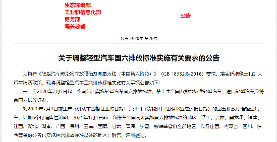 关于调整轻型汽车国六排放标准实施有关要求的公告