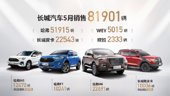 哈弗品牌5月销售51,915辆,同比劲增20%;长城皮卡单月销量突破2万辆,领跑国内皮卡市场。