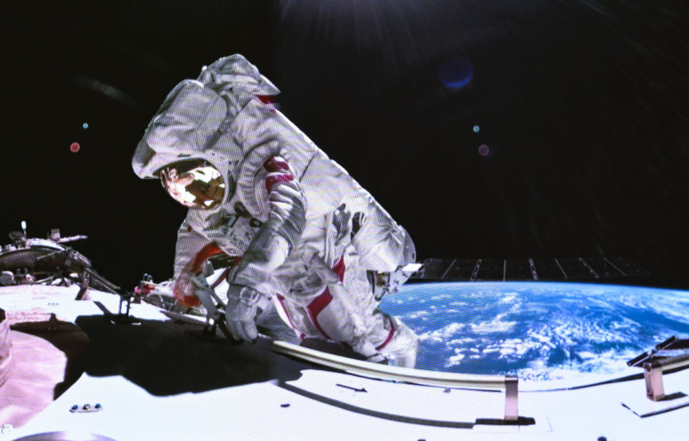 这是2024年3月2日在北京航天飞行控制中心拍摄的神舟十七号航天员汤洪波在空间站组合体舱外作业的画面。
