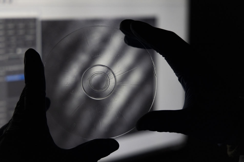 2024年2月29日在上海光机所光学实验室拍摄的“超级光盘”。2月21日,中国科学院上海光学精密机械研究所对外宣布存储容量是普通光盘上万倍、普通硬盘上百倍的“超级光盘”诞生。据计算,十几张“超级光盘”就可以存储下整个国家图书馆的数据量。