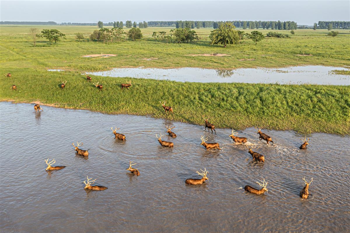 如今,从人工圈养到野外放养,石首麋鹿家族繁衍至3800余头,从当初的1个麋鹿种群发展成现在的4个自然野生麋鹿种群,成为目前世界上最大的麋鹿野生种群,被联合国教科文组织称赞为“全球濒危物种保护的成功范例”。