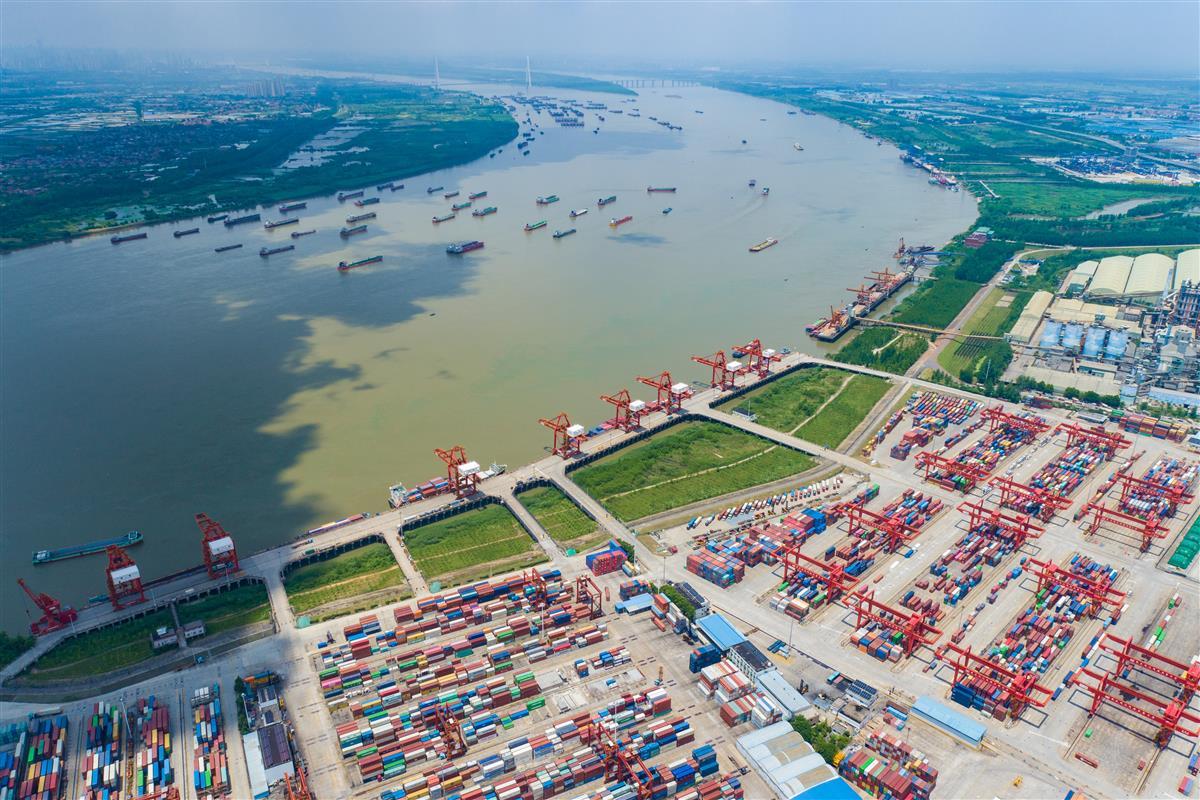 5月23日,武汉阳逻港国际集装箱码头一片繁忙,江上百舸争流(湖北日报全媒记者 任勇 摄)