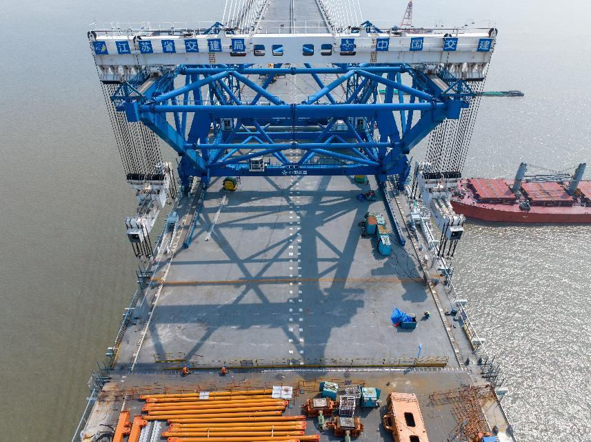 在江苏,长达1208米的世界最大跨度斜拉桥——常泰长江大桥全桥贯通。建设单位在大桥建设过程中投用了QMD-2000型全球最大吨位桥面吊机,研发了抗拉强度高达2100兆帕的斜拉索,打造出国内首条钢桁梁全过程智能生产线……依托5G、大数据、物联网等信息技术,常泰长江大桥建设还实现了对施工全过程的“可知、可测、可控”。