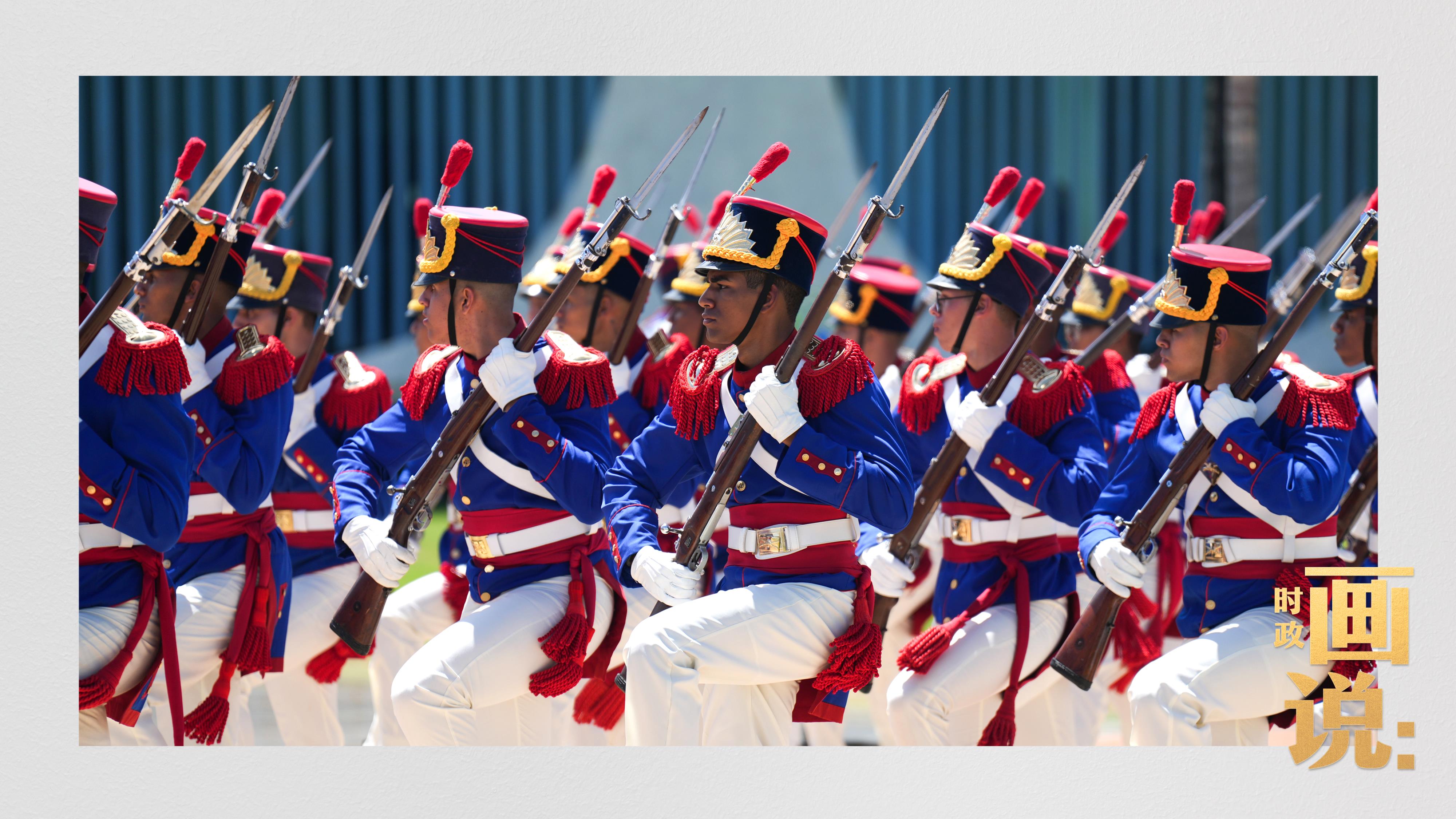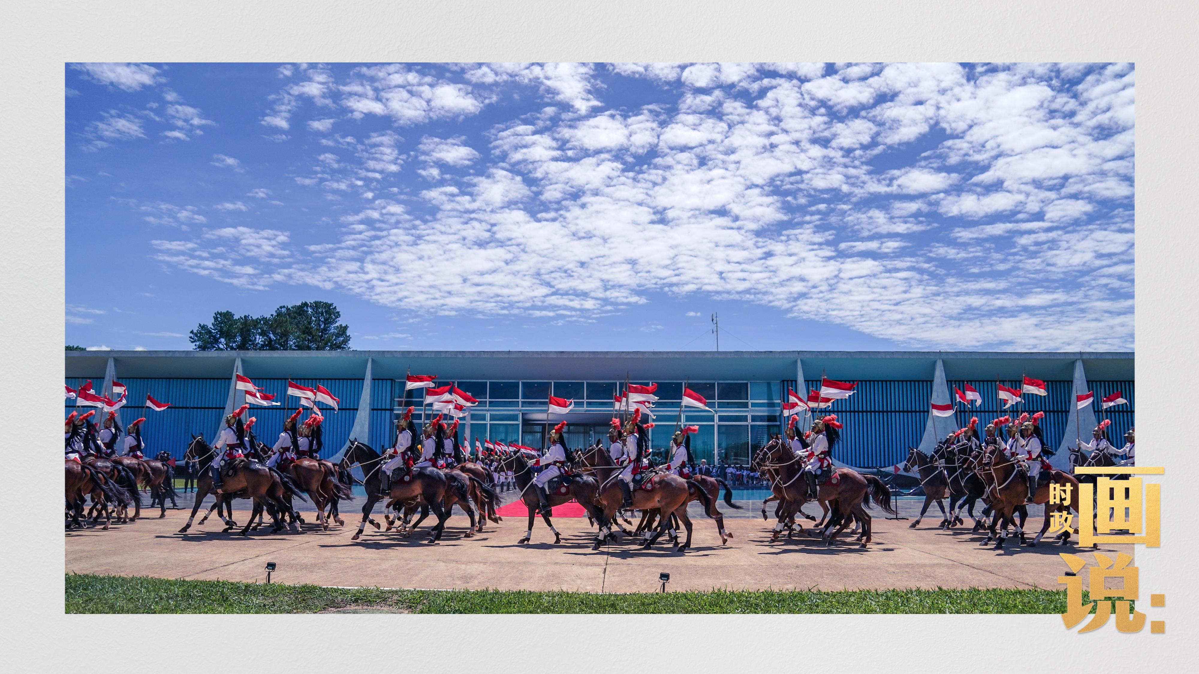 骑兵护卫习近平主席专车抵达仪式现场,巴西艺术家用中文深情唱响中国经典民歌《我的祖国》,现场气氛隆重热烈。