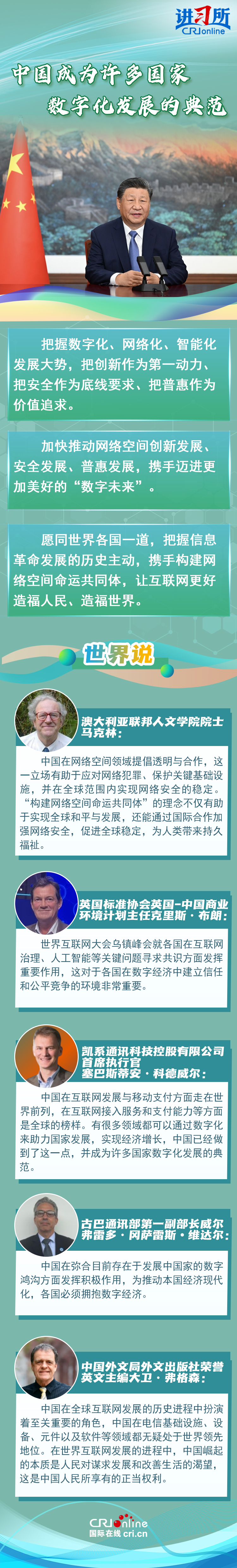 多国人士表示,中国在全球互联网发展的历史进程中扮演着至关重要的角色,“构建网络空间命运共同体”的理念不仅有助于实现全球和平与发展,还能为人类带来持久福祉。