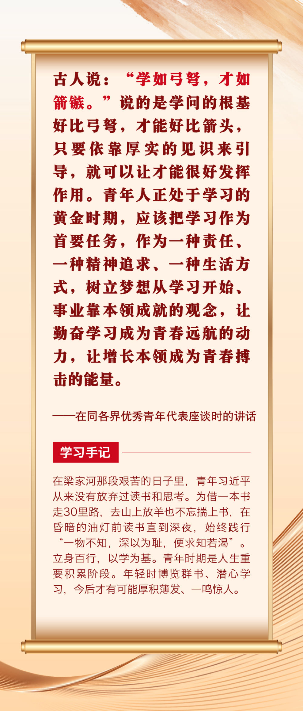“青年者,国家之魂。”青年一代以何种精神风貌站上时代舞台,关乎祖国的明天、民族的未来。党的十八大以来,习近平总书记围绕青年成长成才作出许多重要论述。其中,有信手拈来的精妙典故,有贯古通今的广征博引,引领广大青年不断在中华文化的浸润中坚定中国心、涵养民族魂,成长为堪当复兴重任的时代新人。