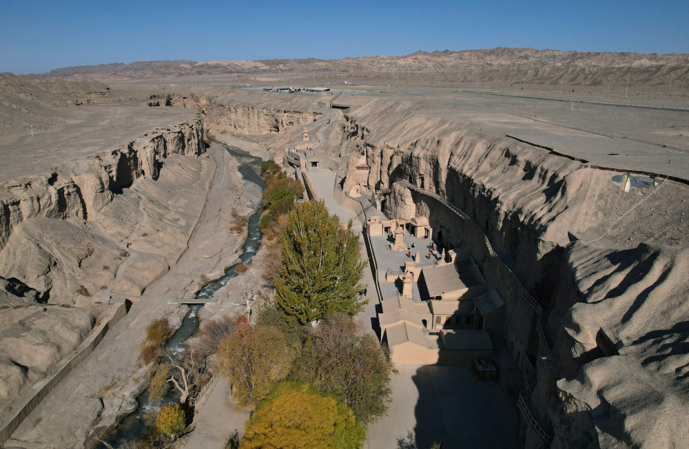 2025年10月30日,在敦煌石窟文物保护研究陈列中心,游客使用AR设备在复制洞窟参观体验。