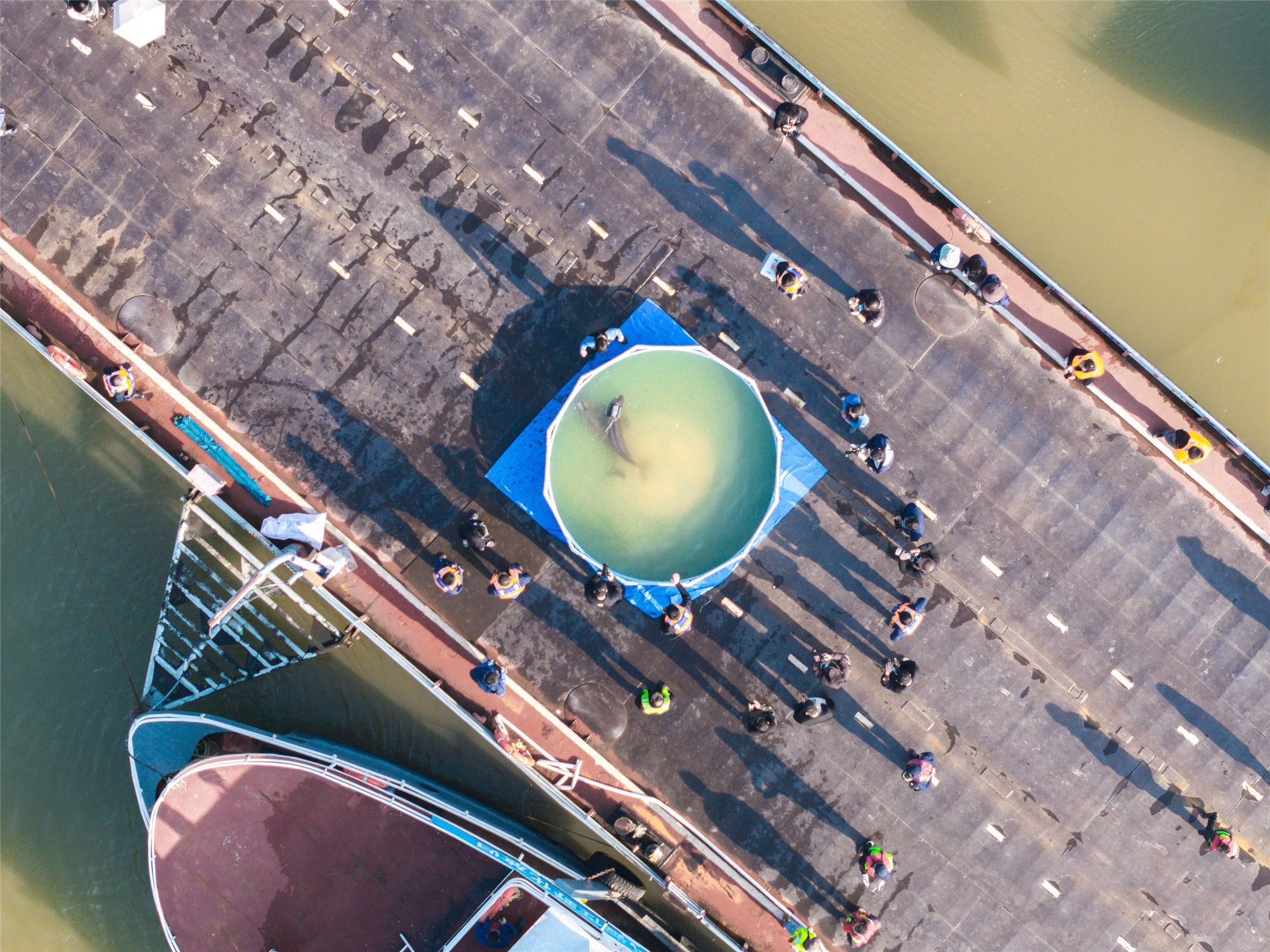 两只长江江豚回归长江前,在驳船上的“舒缓池”中游弋