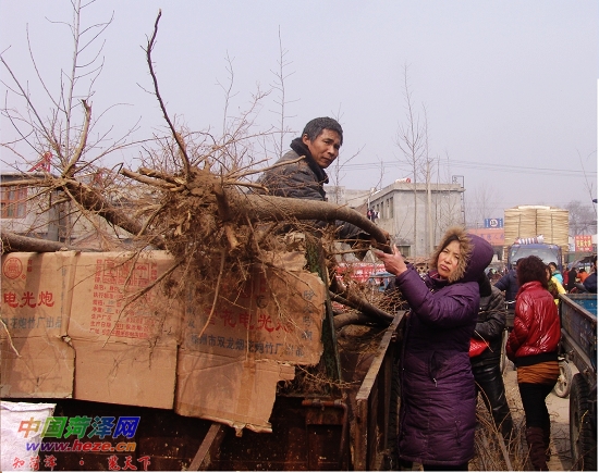 3月17日,在牡丹区胡集镇的集市上,村民陈雪梅花正在挑选杨树苗。据了解,该镇从事杨木旋皮的个体户已达1000余户,木材年加工200万方以上。木材加工业的兴起,带动了群众的植树热情,群众自觉地利用田间地头、路边、村头荒等地植树造林,既增加了收入,又提高了森林覆盖率。