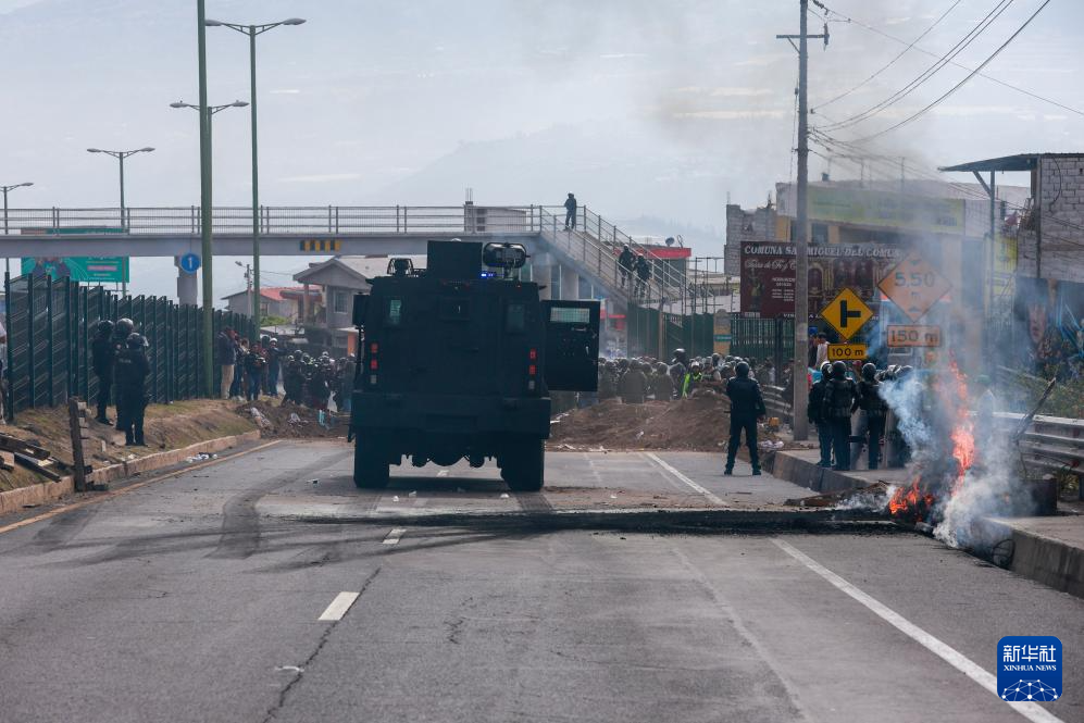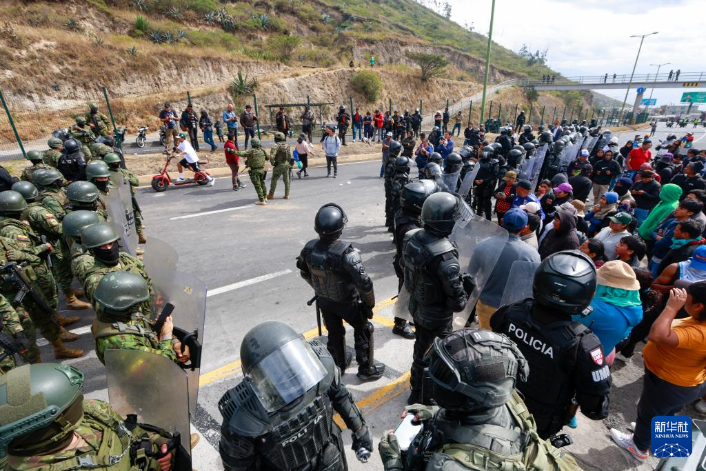 9月16日,在厄瓜多尔首都基多,武装部队人员和警察在道路上维持秩序。新华社发(里卡多·兰德塔摄)