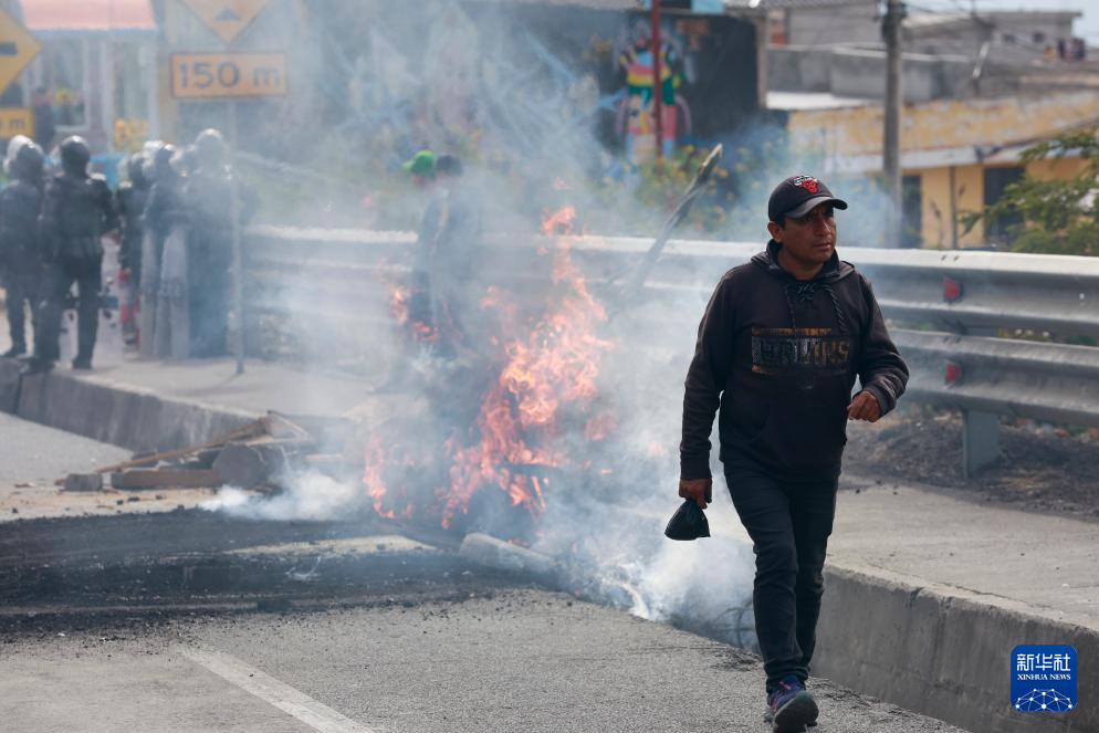 9月16日,在厄瓜多尔首都基多,一名路人经过示威者点燃的路障。新华社发(里卡多·兰德塔摄)