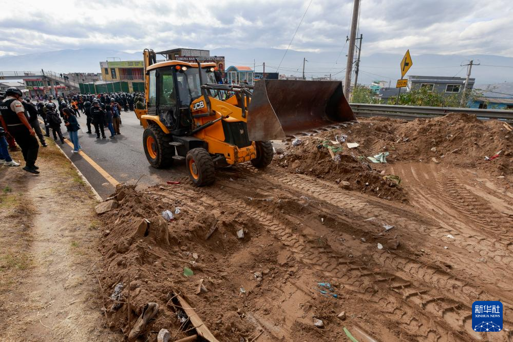 9月16日,在厄瓜多尔首都基多,一辆推土机在清理示威者设置的路障。新华社发(里卡多·兰德塔摄)