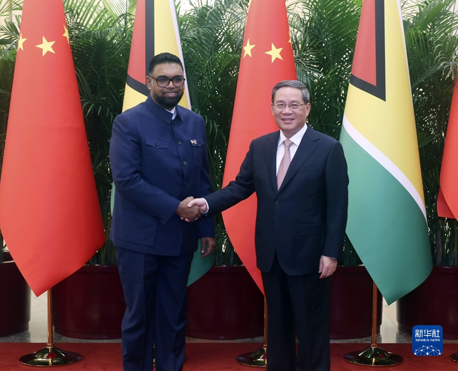 7月30日下午,国务院总理李强在北京人民大会堂会见来华出席第31届世界大学生夏季运动会开幕式并访华的圭亚那总统阿里。新华社记者 刘卫兵 摄