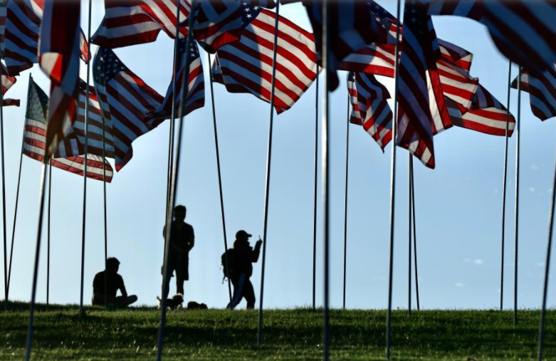 9月10日,人们参观美国加利福尼亚州马利布佩珀代恩大学草坪上的“旗海”。佩珀代恩大学每年9月都在草坪上插上国旗,以纪念“9·11”恐怖袭击事件的遇难者。新华社发