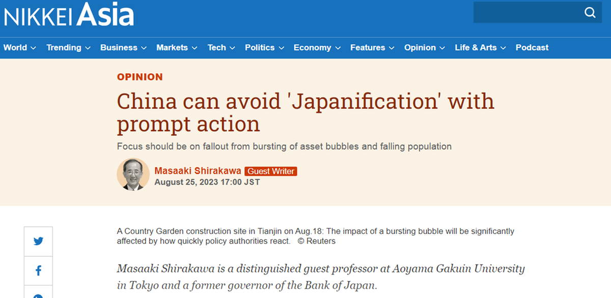 近几个月来,一些西方经济学家热衷于谈论中国经济可能的“日本化”。对此言论,日本央行前行长白川方明在日经新闻网刊文称,从表面上看,中国目前的情况与后泡沫时期的日本类似,这重新引发了人们对中国经济是否会遭受与日本同样命运的讨论。