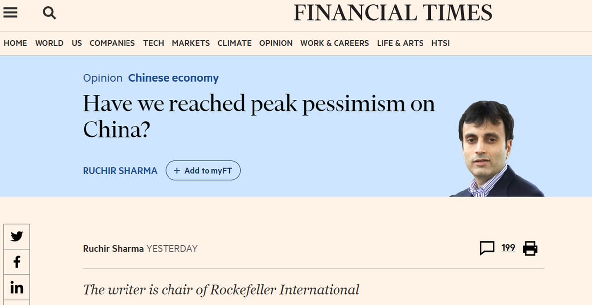一度“看衰中国”的洛克菲勒国际集团董事长鲁奇尔·夏尔马在《金融时报》的文章中也不得不承认,中国经济复苏遇到了一些起伏,但是,西方“反华”情绪如此高涨,意识形态的蒙蔽阻碍了评论者看到任何积极的东西。